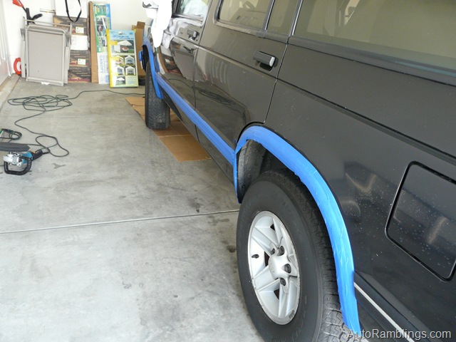 I also want to emphasize prep work. You cannot just take a buffer to a car without thinking how you might possibly damage the trim, rubber, and even bright work. In this picture you can see where masking tape is used to protect the vehicle’s trim. A whack on the trim with a buffer at speed can permanently mar it. It only takes a few extra minutes and saves a ton of grief. Masking tape made for this kind of work has a weaker adhesive bond so that when you are ready to remove it there isn’t any residual goo or stubborn little pieces left behind. Masking tape does not stick well on rubber. So, a good practice is to dress the rubber with a protectant to keep the polish and wax from sticking to it before you begin your work. Draping towels or taping newspaper over glass and grille work saves the hassle of getting in the nooks crannies to clean out polish and wax splatter.